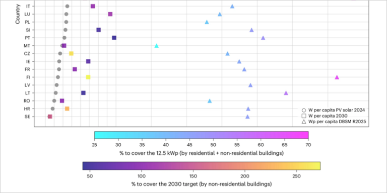 De cara a 2030, más de la mitad del objetivo de capacidad solar fotovoltaica de la UE, fijado en 700 GW, podría alcanzarse únicamente con cubiertas no residenciales. Los grandes edificios, con más de 2.000 m² de superficie de cubierta, podrían alojar alrededor de 355 GW. En varios Estados miembros, como Chipre, Finlandia y Dinamarca, las cubiertas no residenciales podrían cubrir el 95% o más de los objetivos nacionales de energía solar definidos en los Planes Nacionales de Energía y Clima (PNIEC) 2021-2030, actualizados en 2024.