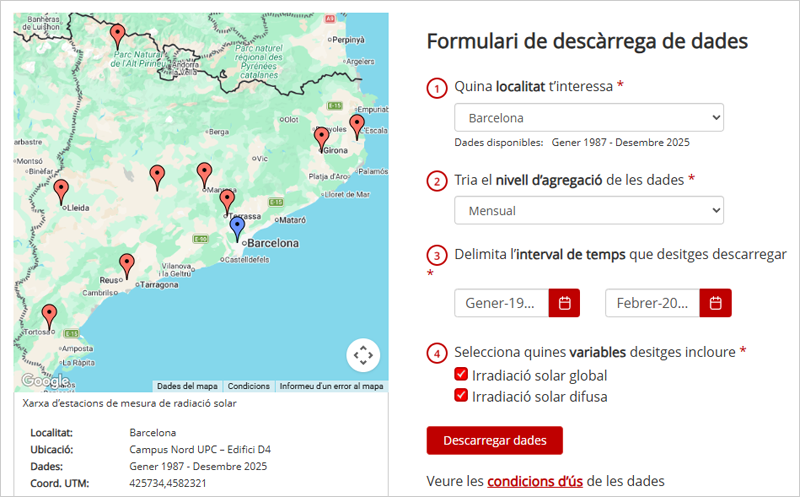 Los datos proceden de 10 estaciones de medida propiedad del Icaen, situadas en Barcelona, Roquetes, Girona, Lleida, las Planes de Son, Manresa, Pujalt, Reus, Terrassa y Torroella de Montgrí. La información disponible incluye tanto la radiación solar global como la radiación difusa, y expresa la energía recibida por unidad de superficie en un tiempo determinado. Las estaciones captan tanto la energía que llega directamente del disco solar como la que, difundida por la atmósfera, procede del conjunto del cielo en función de su estado.