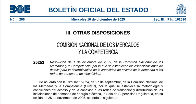 Finalmente, la CNMC recuerda que, conforme a la Resolución de 1 de diciembre de 2025, en la que se establecieron las especificaciones de detalle para calcular la capacidad de acceso de la demanda a la red de transporte de electricidad (RDC/DE/008/25), todas las evaluaciones de capacidad de acceso de la demanda a la red de transporte se realizarán aplicando los nuevos criterios desde el momento de publicación del primer mapa de capacidad.