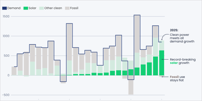 Junto con el crecimiento de otras fuentes limpias, este auge de la energía solar impulsó la energía limpia para satisfacer todo el aumento de la demanda mundial de electricidad en 2025. La energía solar por sí sola cubrió tres cuartas partes (75%) del aumento, mientras que la energía solar y la eólica juntas cubrieron casi la totalidad (99%). Los datos reflejan que, en total, la generación de energía limpia aumentó en 887 TWh, superando ligeramente el crecimiento de la demanda de 849 TWh. Como resultado, la generación con combustibles fósiles descendió un 0,2%, lo que convierte a 2025 en el quinto año del siglo sin crecimiento de la electricidad fósil.