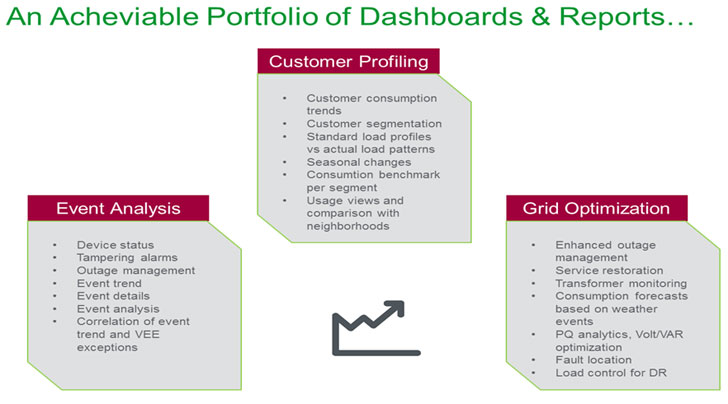 El análisis de los datos de medida, fundamentalmente, así como de otra información procedente de otros sensores y equipos instalados en campo, facilitan la construcción de cuadros de mando y de consultas e informes para mejorar determinados procesos de negocio asociados a la medida y de otros procesos del negocio de la distribución eléctrica.