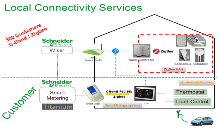 Integración de Smart Meters con equipos eléctricos instalados en la vivienda (caldera, termostato, estaciones de carga coche eléctrico, etc.) mediante comunicaciones C-Band y Zigbee. Esto le permite al usuario, mediante su IHD (in home display) , consultar su consumo instantáneo, tensión, el uso mensual acumulado de energía, etc., así como información sobre precios horarios, de la energía, cortes de energía previstos, señales para hacer un uso más eficiente de la energía, etc.